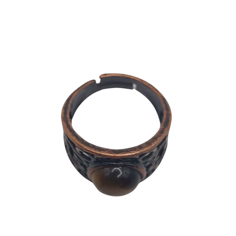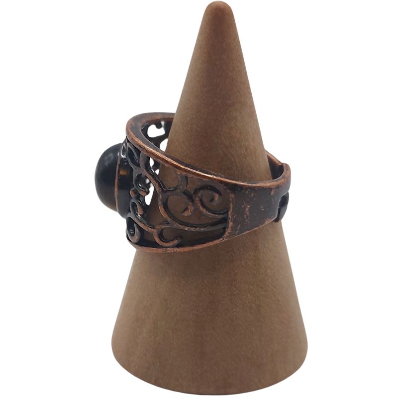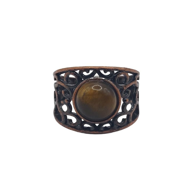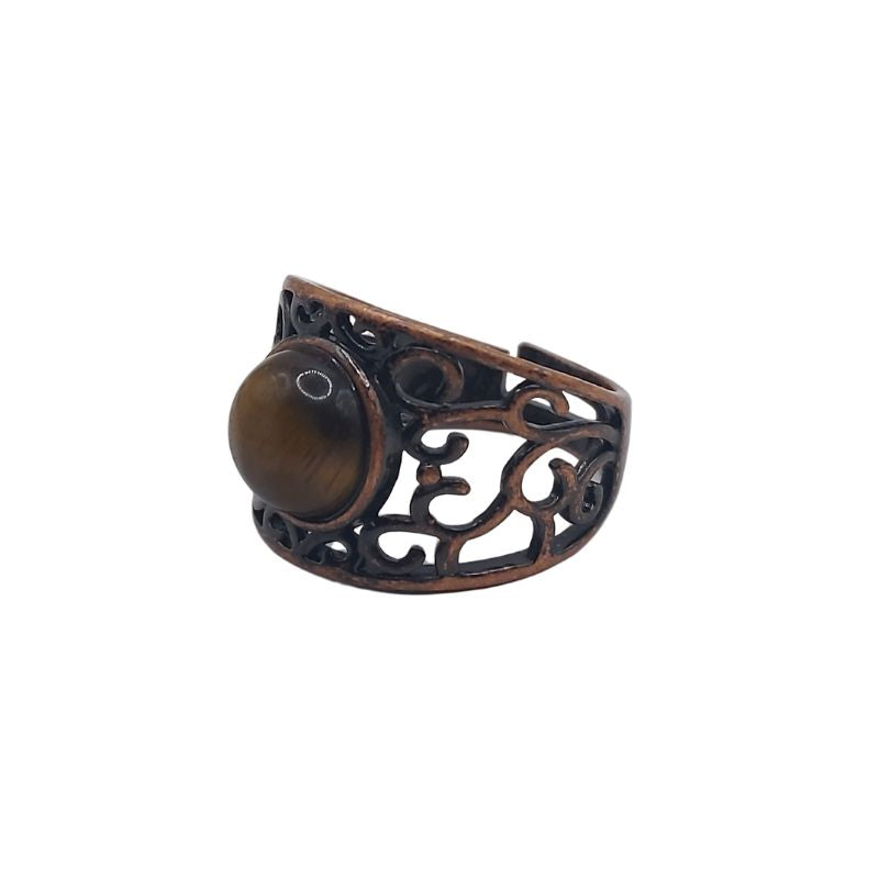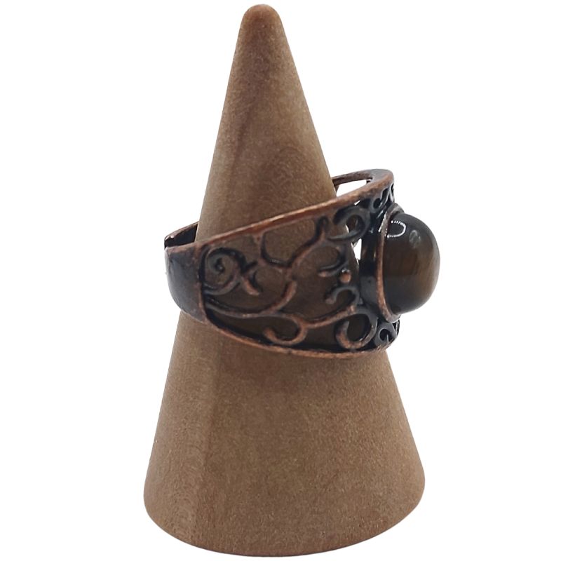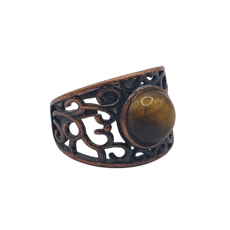 L'Œil de Tigre est une pierre très appréciée pour ses propriétés de protection et de courage. Elle est considérée comme une pierre de pouvoir, apportant à son porteur force intérieure, confiance en soi et équilibre émotionnel. L'Œil de Tigre aide également à dissiper les énergies négatives, tout en favorisant la clarté mentale et la prise de décisions éclairées. En combinaison avec le cuivre rouge, cette bague devient un puissant catalyseur pour l'ancrage et la créativité.